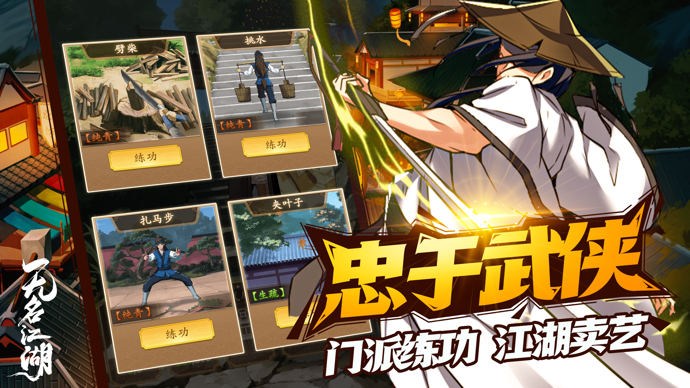 无名江湖是一款以收集百家武学为目标的放置类卡牌游戏。游戏讲述的是玩家作为一个初入江湖的小虾米,在师傅的悉心教导下,一步步成为一代大侠的传奇故事。玩法主打武学卡牌的策略搭配与武侠氛围的体验,喜欢策略玩法与武侠题材的玩家绝对不容错过。游戏采用经典国漫画风,营造的古风场景美轮美奂,给玩家带来沉浸式的江湖体验。